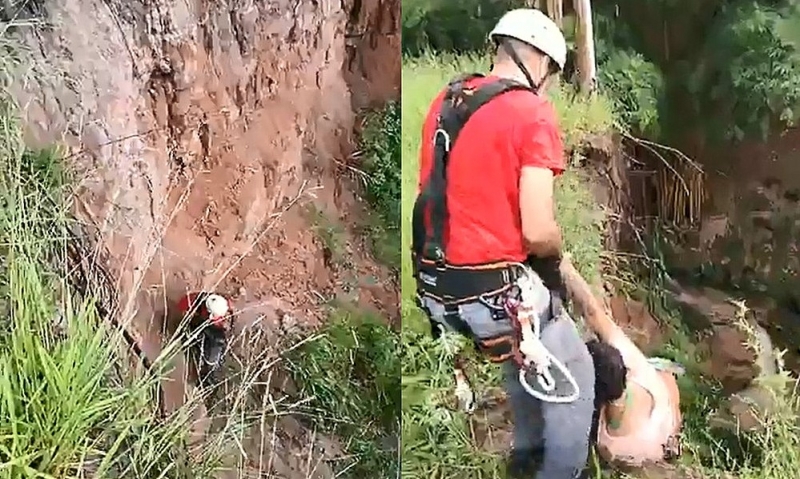 Eles estavam nadando em córrego quando foram surpreendidos por uma tromba d'água e arrastados pela enxurrada. Resgate foi por rapel.