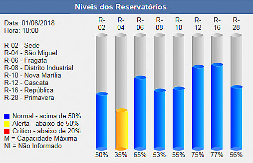 Mas, com as temperaturas baixas e dessa forma consumo menor de água, pelo menos por enquanto os nívels dos reservatórios ainda estão bons, quase todos acima dos 50%, às 10h desta manhã. Apenas o do São Miguel é que está em nível de alerta: 35% da capacidade.