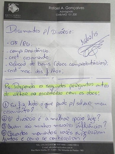 Como de praxe, Rafael pediu à futura cliente os documentos necessários para dar entrada no processo de divórcio, mas adicionou quatro perguntas que poderiam trazer uma reflexão à mulher. “Fiz um pequeno questionário após solicitar os documentos e pedi que a moça respondesse as 4 perguntas a si mesma. Se após responder e analisar a situação com calma, ainda assim resolvesse se divorciar, que bastava me trazer a documentação e eu botaria um fim naquela história!”, afirmou Rafael.