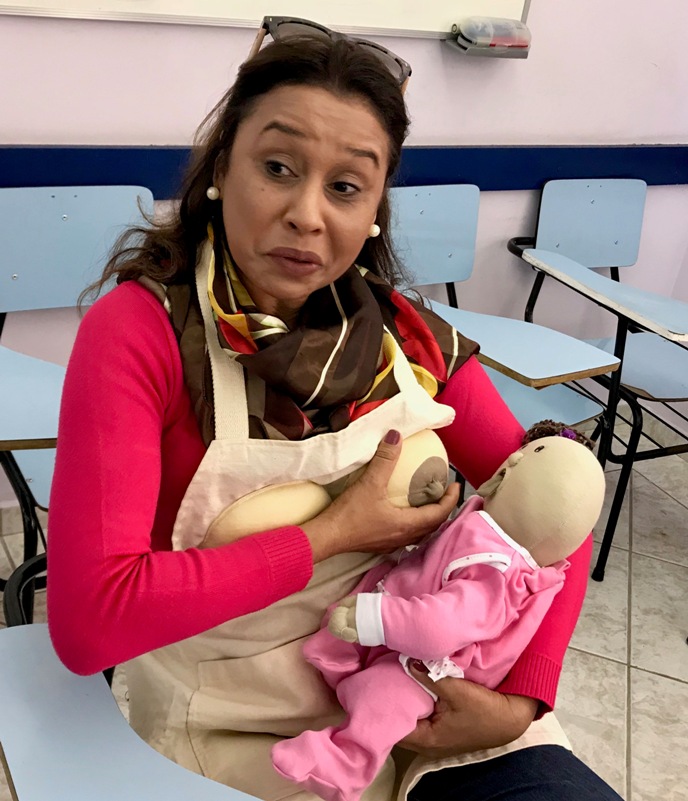 Um dos pontos altos da apresentação foram os objetos levados para demonstração: a boneca Duda, por exemplo, foi colocada em diversas posições nas mamas falsas --- presas a um avental utilizado por uma das enfermeiras ---- para ilustrar a maneira correta da mãe segurar seu bebê para amamenta-lo.