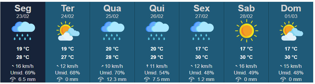 Na terça-feira (dia 24) não há previsão de chuva em Marília, Porém devem ocorrer precipitações entre quarta e sexta-feira (a mais forte na quarta, com 12 mm).