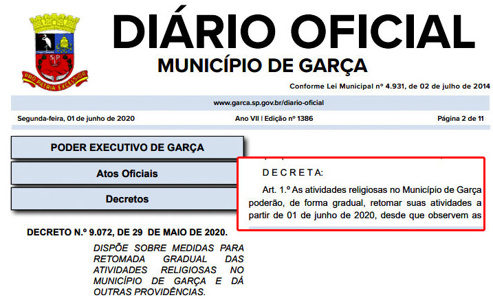 Garça, por exemplo, já baixou decreto permitindo a realização de cultos e missas pelas igrejas, mas com lotação máxima de 40%, distanciamento de dois metros por pessoa e demais medidas de segurança (como uso de máscaras e álcool em gel).
