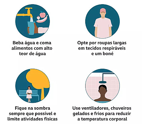 Além disso, evite fazer atividades físicas entre 10h e 16h, bebam bastante água ao longo do dia (ao menos 2,5 litros), usem protetor solar, bonés e chapéus.