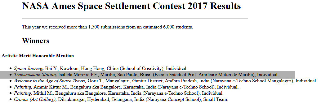 prêmio de menção honrosa na categoria "Mérito Artístico" que a aluna Isabela Moreira Leite Postelhone de Freitas recebeu no concurso de ciência e tecnologia da NASA (Administração Nacional da Aeronáutica e Espaço) sobre Estações Espaciais. As informações foram divulgadas pelo mariliense e pesquisador da NASA, Dr. Ivan Gláucio Paulino Lima.