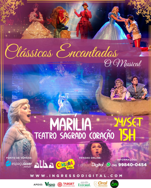 Ainda neste sábado terá a apresentação do "Clássicos Encantados O Musical", às 15hs, também no Teatro Sagrado Coração.