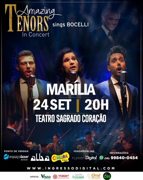 Numa promoção da AVIVA Produções, a Amazing Tenors In Concert despertará um mar de sensações e emoções em show único em Marília, na noite deste sábado (24), às 20h, no Teatro Sagrado Coração.