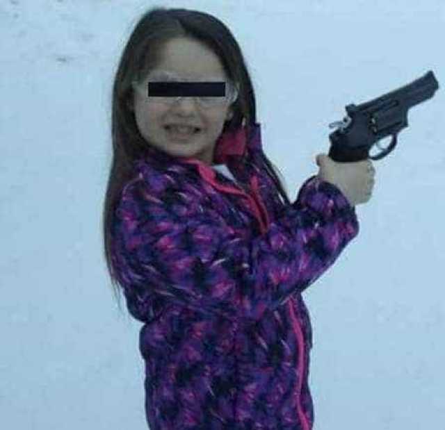 O americano postou fotos em redes sociais mostrando a menina empunhando o revólver com que fora presenteada. A mãe, Kayla, apoia a filha armada em sala de aula.