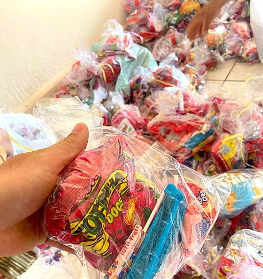 Nesta sexta-feira, além do recebimento de mais doações, o trabalho de todos é preparar os saquinhos com as guloseimas e também separar nas caixas.