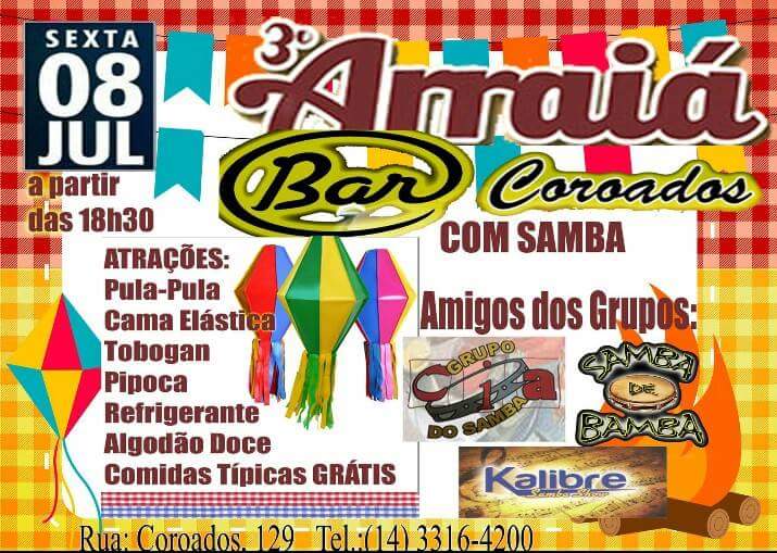 A Organização Social Morro Solidário(Amigos do Bar Coroados) realizam na noite desta sexta-feira (08) a sua 3ª Festa Julina. O evento, que começa às 18h30, deve atrair mais de 300