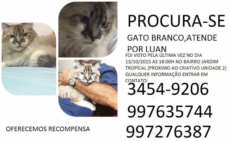 GATO CONTINUA DESAPARECIDO - O gato, que atende pelo nome de "Luan", foi furtado na rua Esperidião Pedro, no jardim Tropical, zona Leste da cidade.
