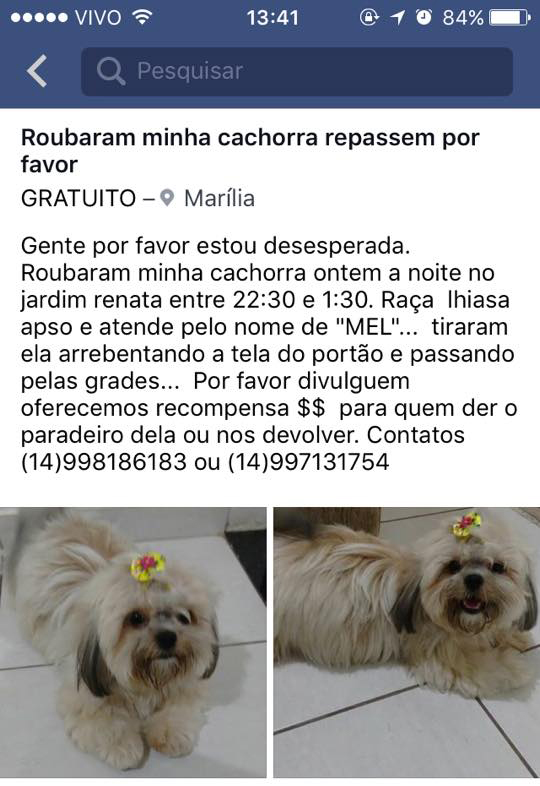 Thiago relatou que "MEL", estava no quintal da residência, no jardim Renata, zona Norte da cidade. Durante a noite de quinta-feira, desconhecidos cortaram a tela e tiraram a cachorrinha pela grade.