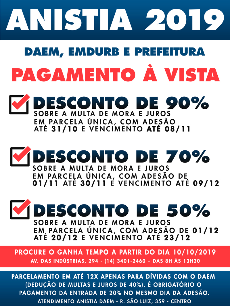 Também será beneficiado quem aderir no último mês do ano (até o dia 20 de dezembro). O desconto será de 50% na multa de mora e juros. O pagamento tem que ser à vista e o vencimento seria dia 23 de dezembro.