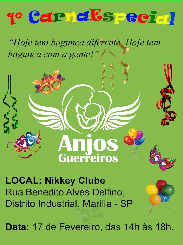 Com objetivo de proporcionar alegria às familias com pessoas com deficiencias e ao mesmo tempo aproximar outras crianças, a Associação Anjos Guerreiros de Marília realiza neste sábado (17), das 14h às 18h, a primeira edição do CarnaEspecial. O evento será realizado na sede campestre do Nikkey.