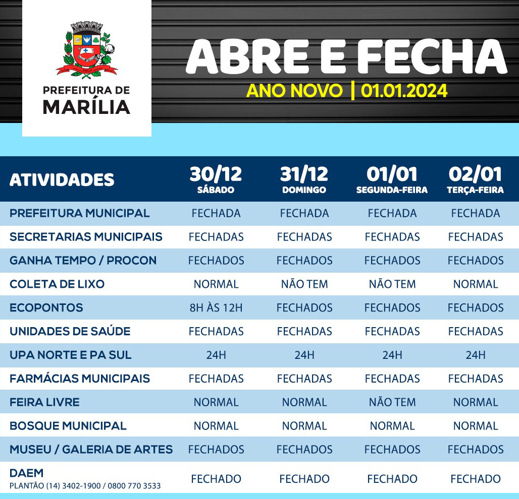 As repartições públicas municipais de Marília (Prefeitura, Secretarias, Ganha Tempo e Procon) só funcionam até hoje. O atendimento voltará ao normal apenas na quarta-feira (dia 3 de janeiro).