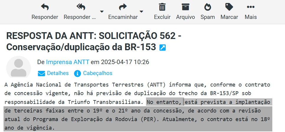 Apesar de não estar prevista (em contrato) a duplicação de todo o trecho paulista da rodovia Tranbsbrasiliana (BR-153) a concessionária responsável, Tribunfo Transbrasiliana, terá que implantar terceiras faixas a partir do ano que vem (2026) e com previsão de conclusão em dois anos. A informação é da Agência Nacional de Transportes Terrestres (ANTT), em resposta à demanda formulada pelo Visão Notícias.
