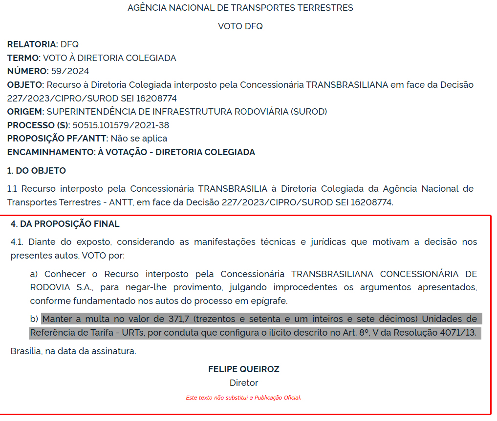 Mas, somente em uma delas, em que a ANTT não reconheceu recurso da própria Triunfo, foi aplicada multa de 317,7 URT (Unidade de Referência da Tarifa). Levando-se em conta que em outro trecho da própria BR-153 esse valor é de mil vezes o preço básico da tarifa, somente esta multa chegaria a R$ 3,5 milhões.