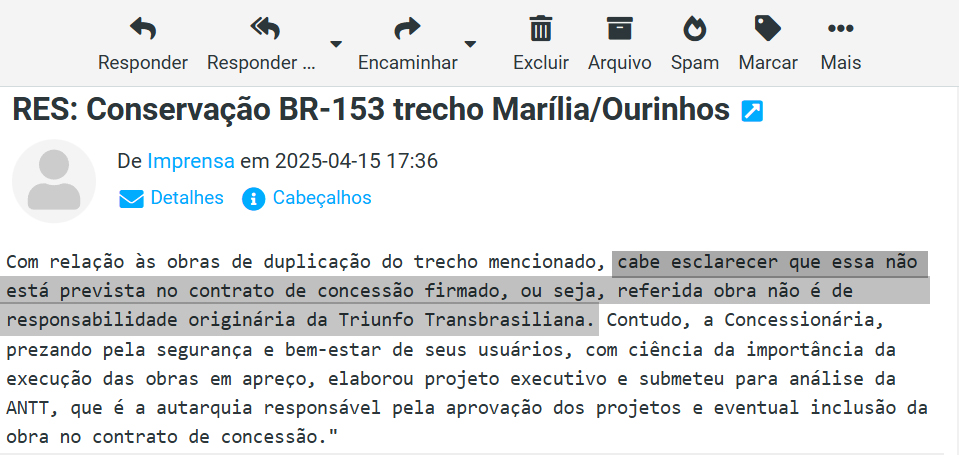 Em nota enviada ao Visão Notícias, a Triunfo Transbrasiliana descartou a possibilidade de duplicação do trecho não deve ocorrer uma vez que "não está prevista no contrato de concessão firmado, ou seja, referida obra não é de responsabilidade originária da Triunfo Transbrasiliana". Mas, informou que "elaborou projeto executivo e submeteu para análise da ANTT, que é a autarquia responsável pela aprovação dos projetos e eventual inclusão da obra no contrato de concessão."