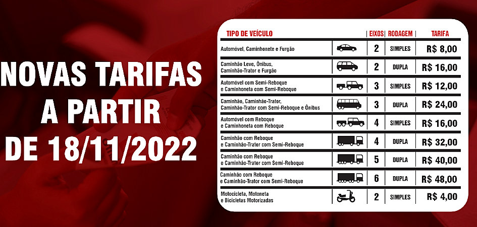 De acordo com a publicação no Diário Oficial da União, a tarifa básica passará de R$ 7,70 para R$ 8,00, válido para carros, ônibus e caminhões; e de R$ 3,85 para R$ 4,00 válido para motocicletas, motonetas e bicicletas motorizadas.