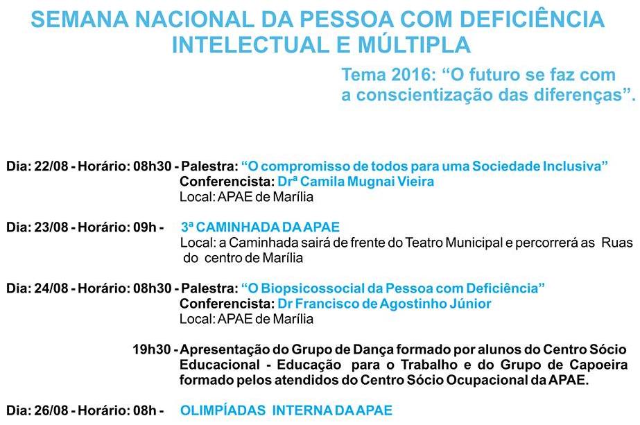 A APAE (Associação de Pais e Amigos dos Excepcionais) de Marília realiza a partir de hoje (22) até o próximo domingo (28), a Semana Nacional da Pessoa com Deficiência Intelectual e Múltipla. Neste ano, também serão realizadas atividades externas para conscientizar a população sobre as diferenças.