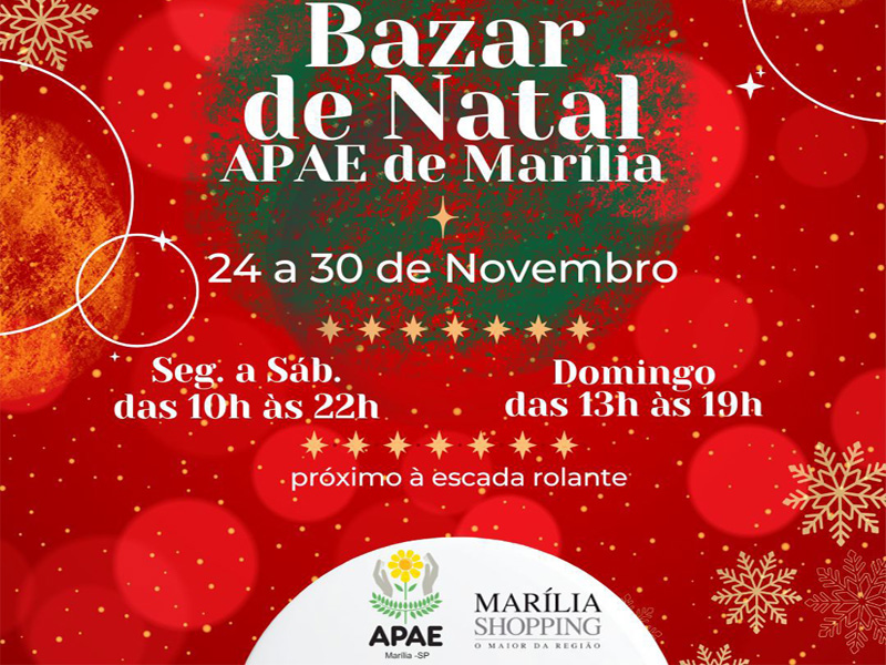 A Associação de Pais e Amigos dos Excepcionais (APAE) de Marília promove até o próximo domingo (30 de novembro), o seu tradicional Bazar de Natal. O evento será realizado no Marília Shopping, reunindo uma ampla variedade de produtos artesanais confeccionados pelo grupo de voluntárias da associação.