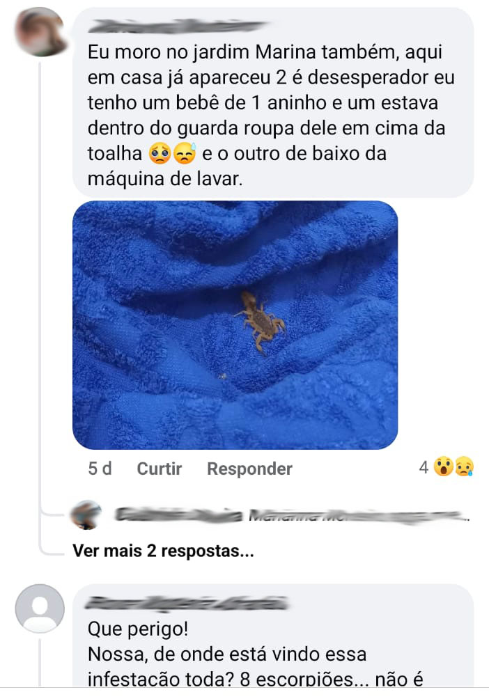 - "Esses escorpiões foram achados nas casas dos moradores aqui do bairro e compartilhados através de um grupo que temos do bairro. Isso é na esquina da minha casa" (também não informou o bairro).