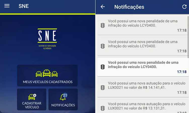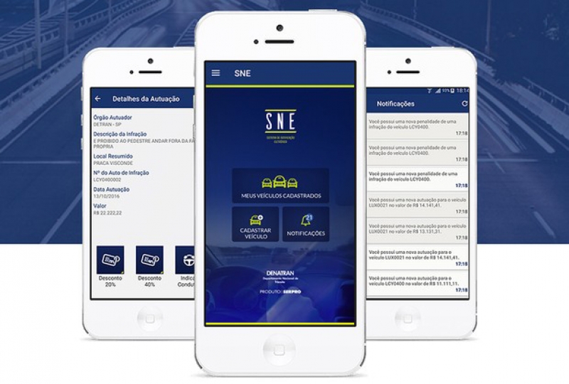 O Departamento Nacional de Trânsito (Denatran) lançou o Sistema de Notificação Eletrônica (SNE) para facilitar a comunicação de infrações de trânsito pelos órgãos de autuação e para identificar o perfil dos infratores. Os condutores de veículos poderão fazer o download do aplicativo no celular e terão a opção de pagar a multa com