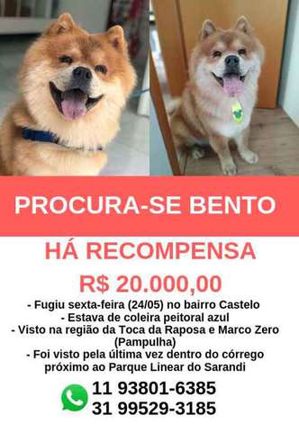 Procura-se Bento. E quem encontrá-lo, terá em mãos R$ 20 mil. Parece coisa de bilhete premiado. Quase isso. Bento é um cachorro da raça chow chow que desapareceu no Bairro Castelo, na Região da Pampulha, em Belo Horizonte. A recompensa é oferecida pela empresa dona do DogHero, aplicativo de hospedagem de cães por famílias anfitriãs. O animal pertence a um engenheiro civil que, viajou com a família para Portugal e não tinha com quem deixá-lo.