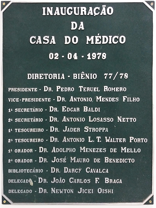 Placa de inauguração da Casa do Médico. Grande reforma após 38 anos.