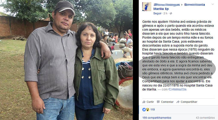 morando na cidade e que seria irmão gêmeo do serviços gerais Marcelo Rodrigues. A história começou há 37 anos, quando a avó dele teria doado o seu irmão logo após o parto alegando que não teria como cuidar dele. "A gente acredita que divulgando pela internet as fotos, alguém possa encontrar este meu outro filho que eu nunca conheci", afirmou a mãe de Marcelo, Maria Aparecida Otre, hoje com 57 anos.