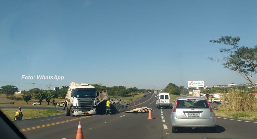A tampa da carreta abriu e quase toda carga ficou espalhada na rodovia.