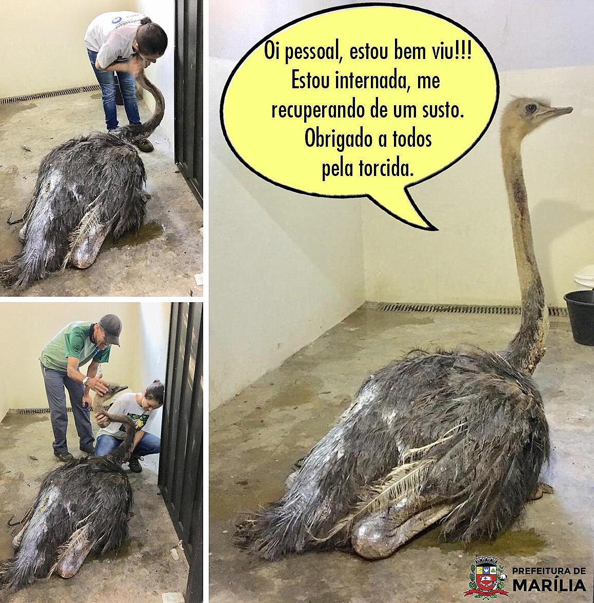 O avestruz que foi atacado pela onça está se recuperando, após receber atendimento veterinário.