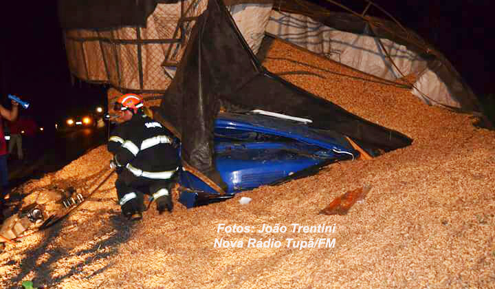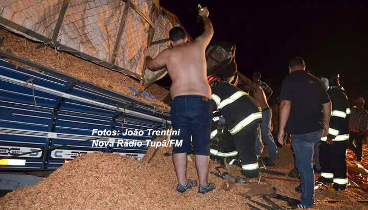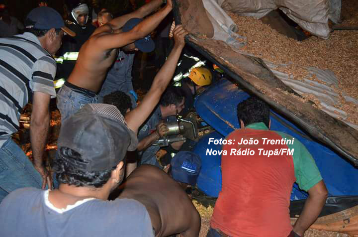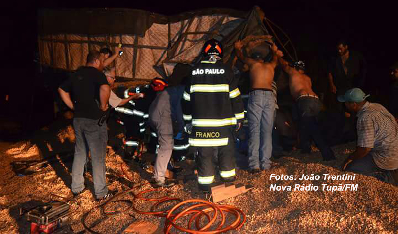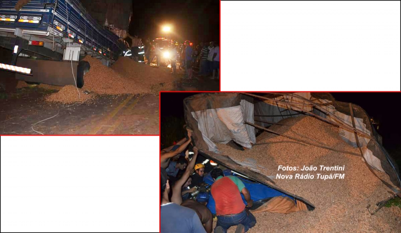 Equipes do Corpo de Bombeiros de Tupã, ajudados por voluntários, tiveram muito trabalho para resgatar um caminhoneiro que ficou soterrado por uma carga de amendoim, após o caminhão bater contra um barranco. Ele só foi retirado depois de aproximadamente 40 minutos.