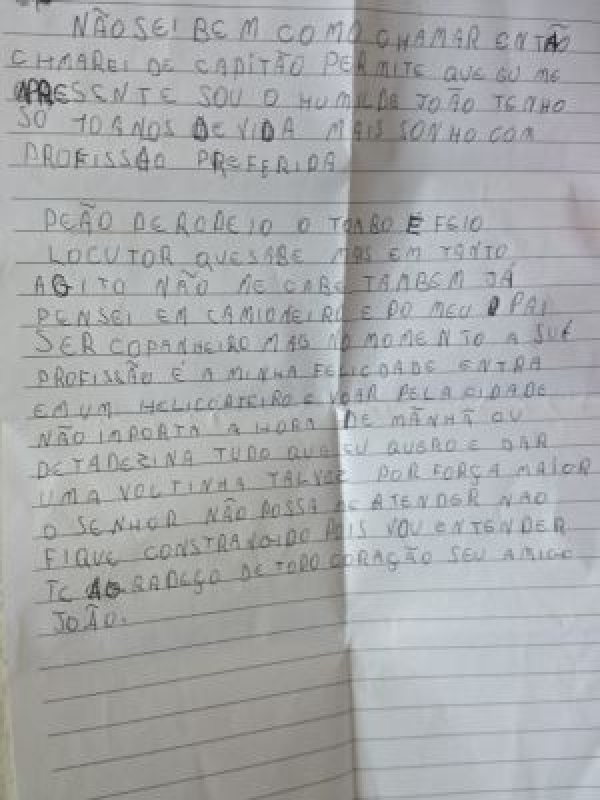 “Tenho só 10 anos de vida, mas sonho com a profissão preferida... No momento a sua profissão é a minha felicidade, entrar em um helicóptero e voar pela cidade. Não importa a hora, de manhã ou de tardezinha. Tudo o que eu quero é dar uma voltinha. Talvez por força maior o senhor o senhor não possa me atender, mas não fique constrangido, pois vou entender. Te agradeço de todo coração. Seu amigo, João.”