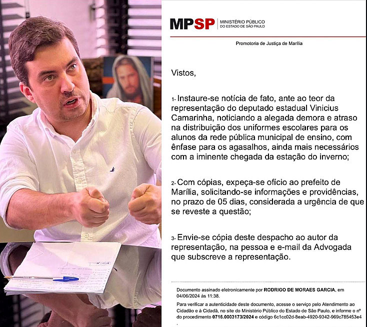 O MP-SP (Ministério Público) acatou representação de Vinícius Camarinha, deputado estadual e líder da Federação PSDB/Cidadania, e determinou a abertura de inquérito para apurar o atraso na entrega dos uniformes escolares pela Prefeitura de Marília.