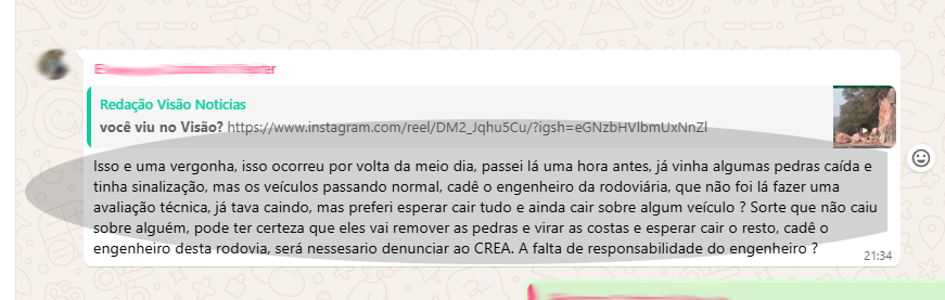 Outro internauta denunciou: "Isso e uma vergonha, isso ocorreu por volta da meio dia, passei lá uma hora antes, já vinha algumas pedras caída e tinha sinalização, mas os veículos passando normal, cadê o engenheiro da rodoviária, que não foi lá fazer uma avaliação técnica, já tava caindo, mas preferi esperar cair tudo e ainda cair sobre algum veículo?".