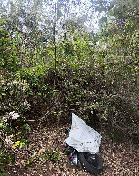 A motocicleta estava coberta por um lençol como forma de dificultar ainda mais a sua localização e ainda apresentava a placa amassada. Possivelmente depois de alguns dias seria retirada daquele local para um desmanche ou mesmo ser desmontada ali mesmo.