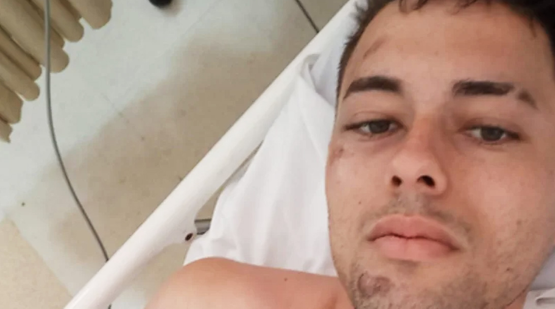 O rapaz literalmente chegou a voar e foi jogado contra uma placa de sinalização, sofrendo graves ferimentos no braço direito, além de hemorragia em órgãos vitais, como baço e rins, ficando internado na UTI em estado grave (foto).