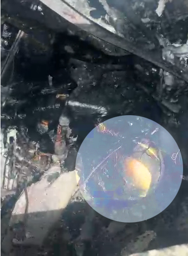 Um vídeo que foi divulgado, após o incêndio, ter sido controlado, é possível perceber uma ossada humana provavelmente no banco traseiro. O crânio (foto) aparenta um ferimento que provocou uma rachadura, mas que também pode ter ocorrido pelo fogo. O portal acompanha o caso.