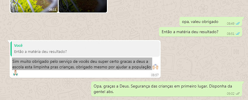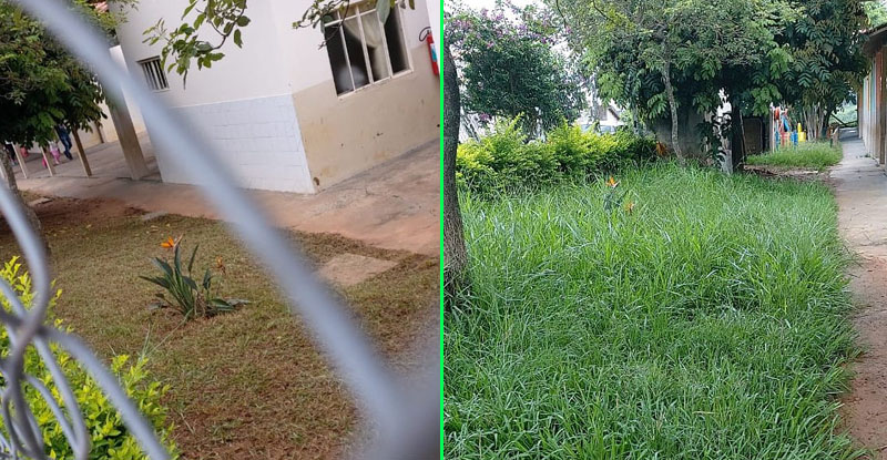 Alguns pais enviaram mensagens via WhatsApp (99757-7215) denunciando que ontem as crianças estavam voltando das férias, mas que as condições eram perigosas, ou seja, com o matagal aumentava o risco de animais e insetos atacarem os alunos. Eles procuraram a direção, mas a resposta foi de que não tinha previsão dos serviços serem executados.
