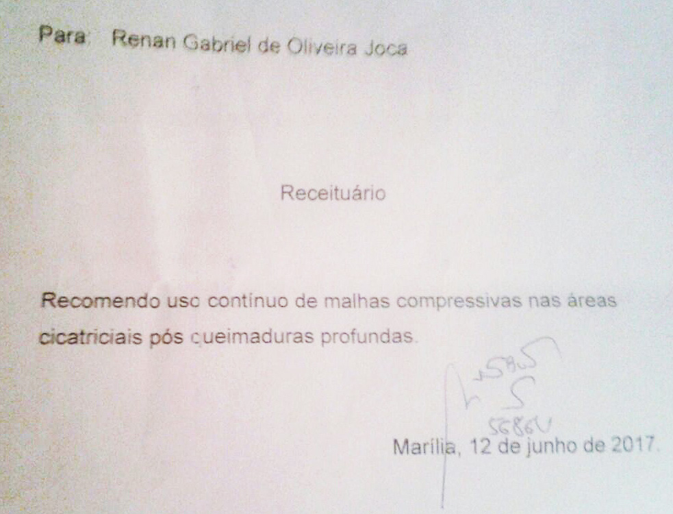 TRATAMENTO - O menino sofreu graves queimaduras e foi internado na UTI do Hospital Materno Infantil e, após conseguir uma vaga, foi transferido para a UTQ. Foram exatos seis meses de tratamento hospitalar. Renan está recuperado, mas ainda precisa utilizar malhas compressivas nas áreas cicatrizadas, segundo recomendação médica.
