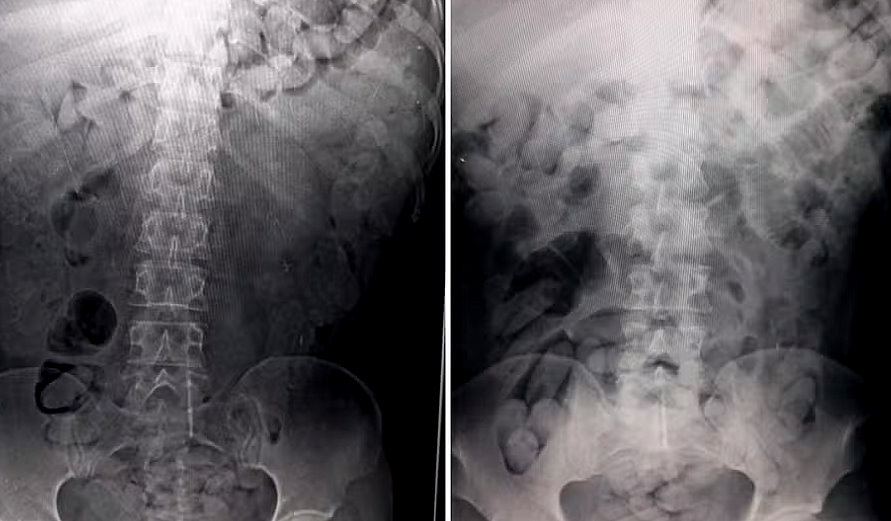 O casal foi encaminhado ao HC, onde radiografias (foto) confirmaram a existência da droga. Para expelir as cápsulas, eles tiveram que passar por lavagem estomacal. A operação durou três dias.