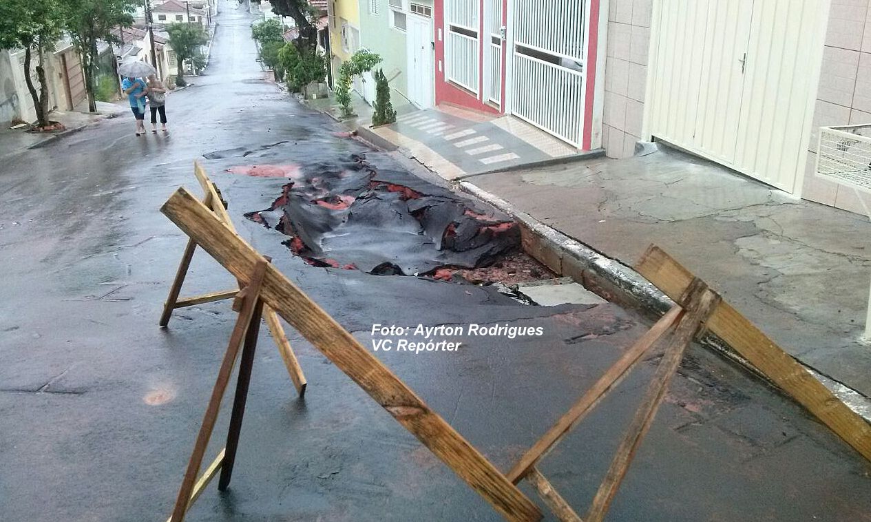 uma enorme cratera que colocou em risco a tubulação e deixando novamente um dos moradores sem condições de tirar o carro da garagem.