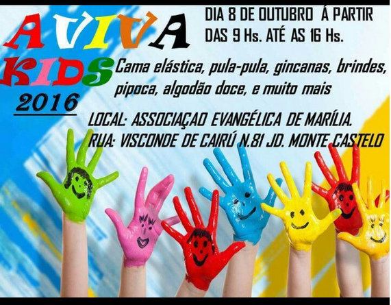 O "AVIVA KIDS 2016" será a segunda ação social que a entidade desenvolve na atual presidência do pastor Antônio Prediger, após ficar dois anos sem atividades. A Associação está localizada na rua Vinconde do Cairú, 81, no jardim Monte Castelo.