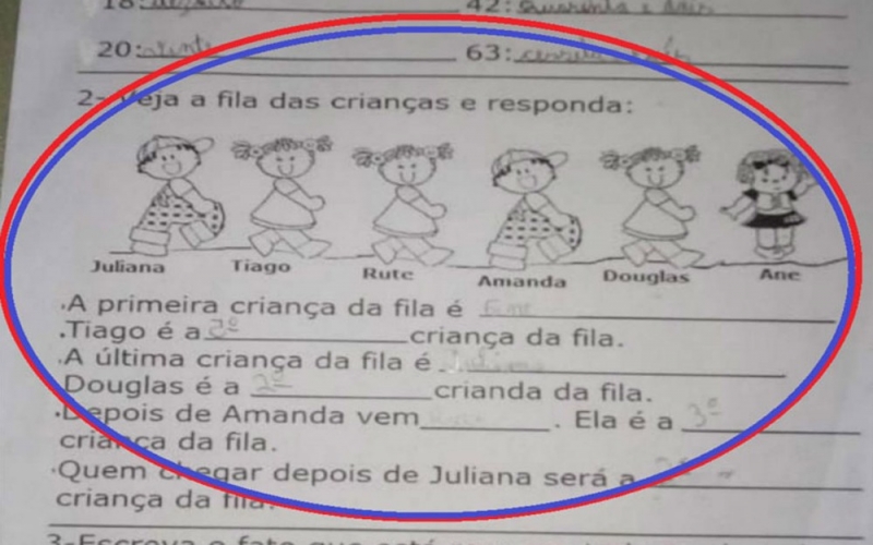 A situação ocorreu na Escola Municipal Santa Rita de Cássia. A atividade aplicada para os alunos do 2º ano do Ensino Fundamental I, que têm entre 7 e 8 anos, conta com figuras em sequência de seis crianças. A professora pede que os alunos indiquem a ordem de cada uma delas na imagem.