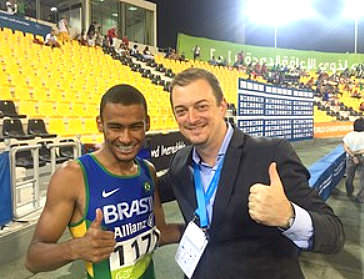 Enrolado a uma bandeira do Brasil e muito assediado pela mídia ao sair da pista, o paratleta brincou quando foi chamado para tirar uma foto ao lado de Andrew Parsons, presidente do Comitê Paralímpico Brasileiro (CPB): "Andrew? Cinco mil reais!" (foto/direita).