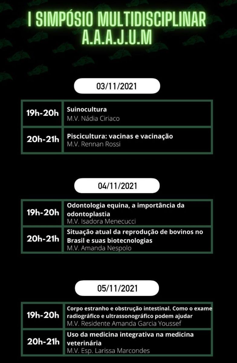 O curso de Medicina Veterinária da Universidade de Marília (Unimar) realiza de 3 a 5 de novembro o 1º Simpósio Multidisciplinar da Associação Atlética Acadêmica Javalis da Unimar (A.A.A.J.U.M).