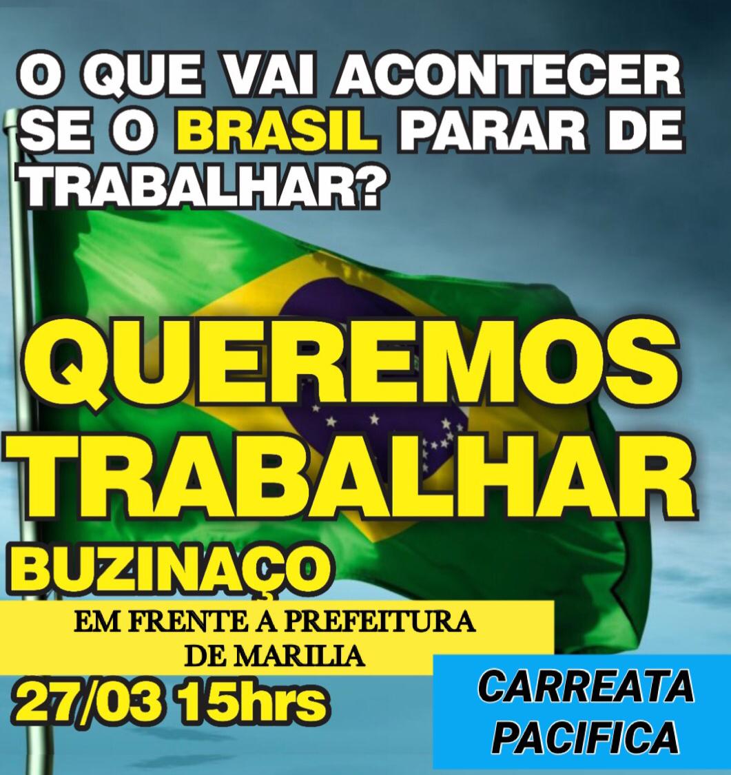 Além da manifestação isolada de lideranças, agora será a vez de um "buzinaço" dos que querem trabalhar durante a quarentena. Reunião hoje à tarde na Prefeitura discute essa e outras medidas.