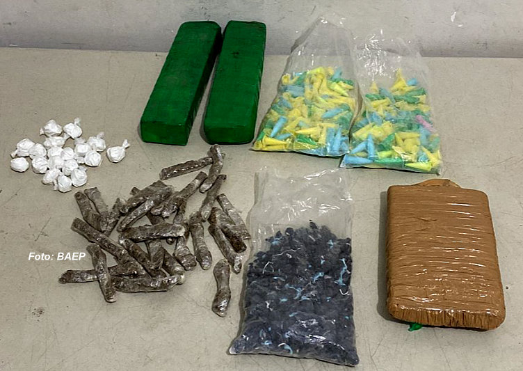 Foram apreendidos dois tabletes de maconha, um tablete de cocaína, 232 pinos de cocaína, 28 invólucros de maconha e 259 papelotes de cocaína.