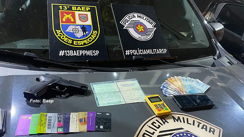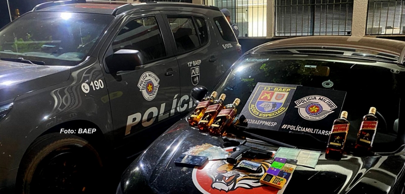 Antes mesmo de conseguir ajuda, uma equipe do Baep, que patrulhava na cidade desconfiou dos suspeitos em um carro em alta velocidade. Durante a abordagem, os policiais encontraram garrafas de bebidas, mais de R$ 1 mil em dinheiro, cartões da vítima e um celular.