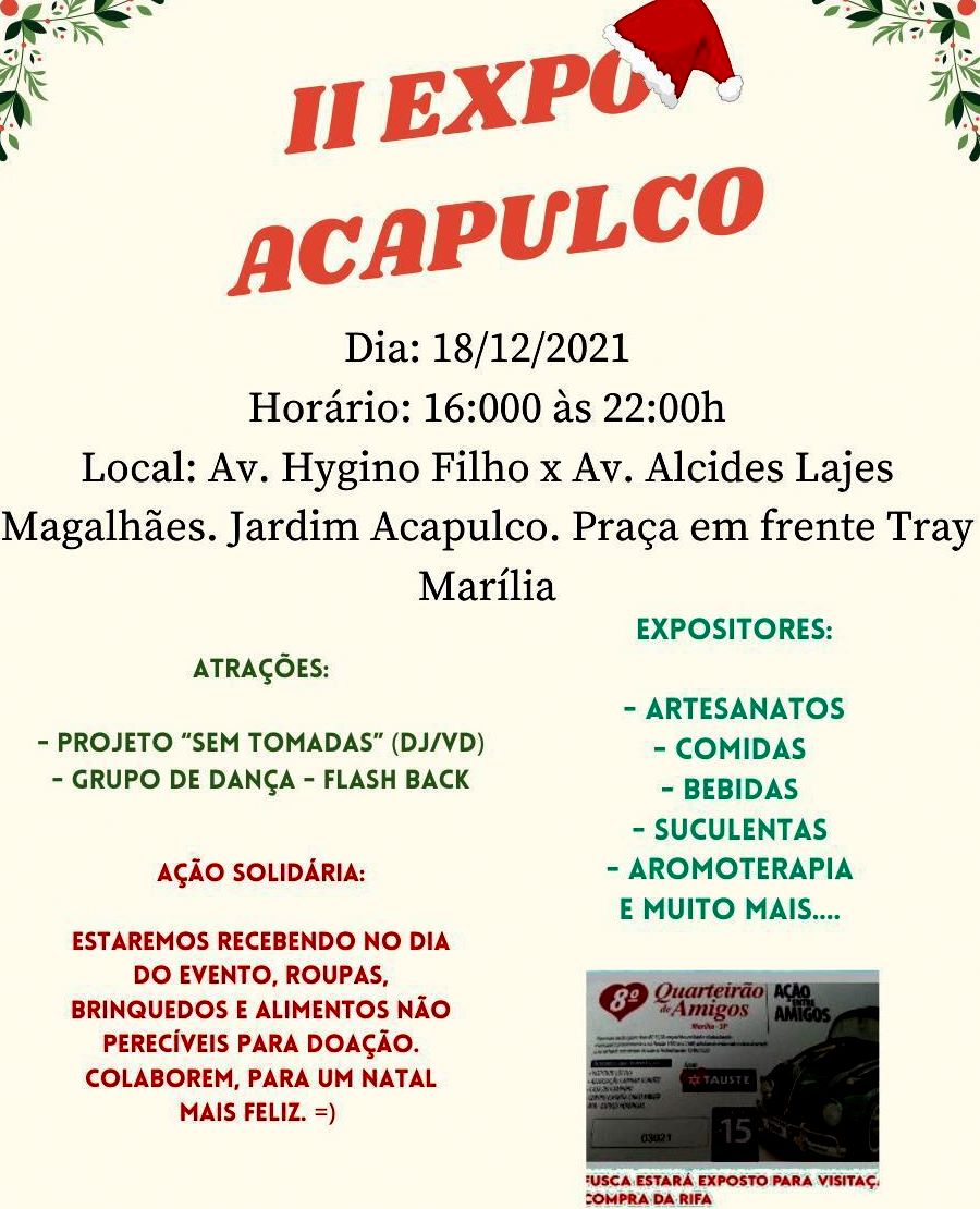 Com diversas atrações para o público, incluindo música, gastronomia, artesanato e também arrecadação de roupas, alimentos e brinquedos, será realizada neste sábado a 2ª Expo Acapulco. O evento é promovido por empreendedores do bairro, localizado na zona oeste da cidade.
